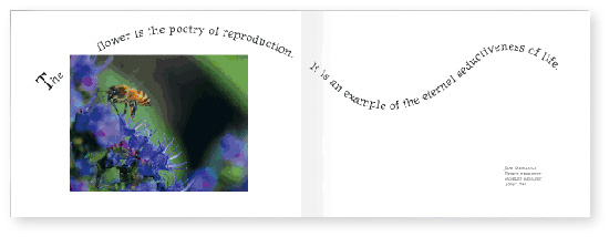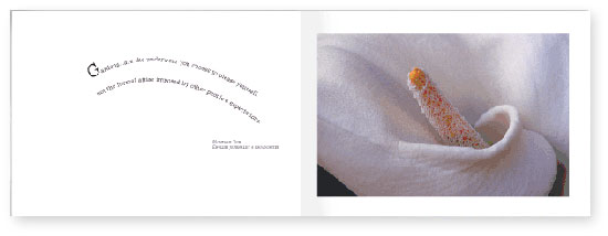 Garden Thoughts is the first title in a series of quote books about life, art and nature. It is an interpretation of how creativity expresses itself into words. "The book contains vibrant photographs of the world around us, art and artists working that is best expressed as a unique collaboration between art and creativity. It combines the visual beauty of the creative life with the sometimes thoughtful, sometimes witty ... and often surprising written word to create a harmonious celebration of life." |